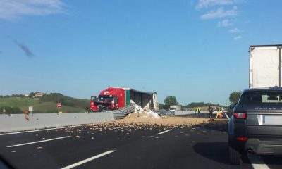 Un auto-articolato che viaggiava sull’A 14 ha urtato il guard rail, per cause che dovrà chiarire la polizia autostradale di Fano, e il carico di patate che trasportava si è riversato sulle due carreggiare dell’autostrada. Un fuori programma che ha intralciato il traffico in viaggio su entrambe le corsie di marcia. L’incidente è avvenuto poco prima delle 8 di stamattina sulla corsia sud, tra i caselli di Ancona Nord e Ancona Sud, al km. 217, proprio ai confini del territorio comunale di Agugliano con quello di Camerano.
