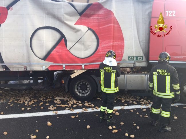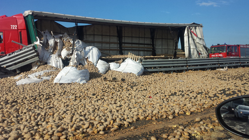 Nell’impatto del mezzo pesante con il guard rail, centinaia di quintali di tuberi, chiusi in grossi sacchi, si sono sbilanciati e riversati prima sulla corsia sud. Poi le patate, ormai libere dai contenitori, solo rimbalzate e rotolate in parte anche su quella nord. Sul posto è intervenuta una squadra dei vigili del distaccamento di Falconara che ha aiutato nelle operazioni di chiusura delle corsie. Tutto il traffico, copioso a quell’ora, è stato, infatti, incanalato su un’unica corsia di marcia per  entrambe le direzioni, per permettere il recupero della merce sull’asfalto ed evitare incidenti stradali. Non sono segnalati feriti o danni ai mezzi in transito ma la circolazione ha subito forti rallentamenti.