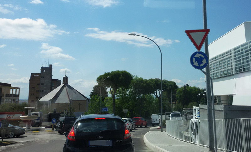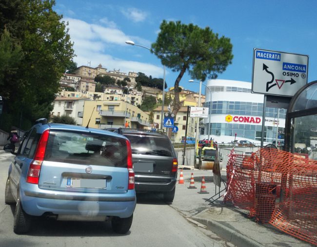 Osimo, traffico in tilt, oggi a mezzogiorno, per i lavori di asfaltatura di via Montefanese davanti al nuovo centro commerciale