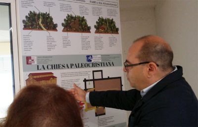 Il pannello didascalico nel parcheggio del nuovo polo commerciale che ricostruisce al computer la basilica cimiteriale e illustra a quale porzione appartengono i muri perimetrali ritrovati e conservati nell’aula didattica