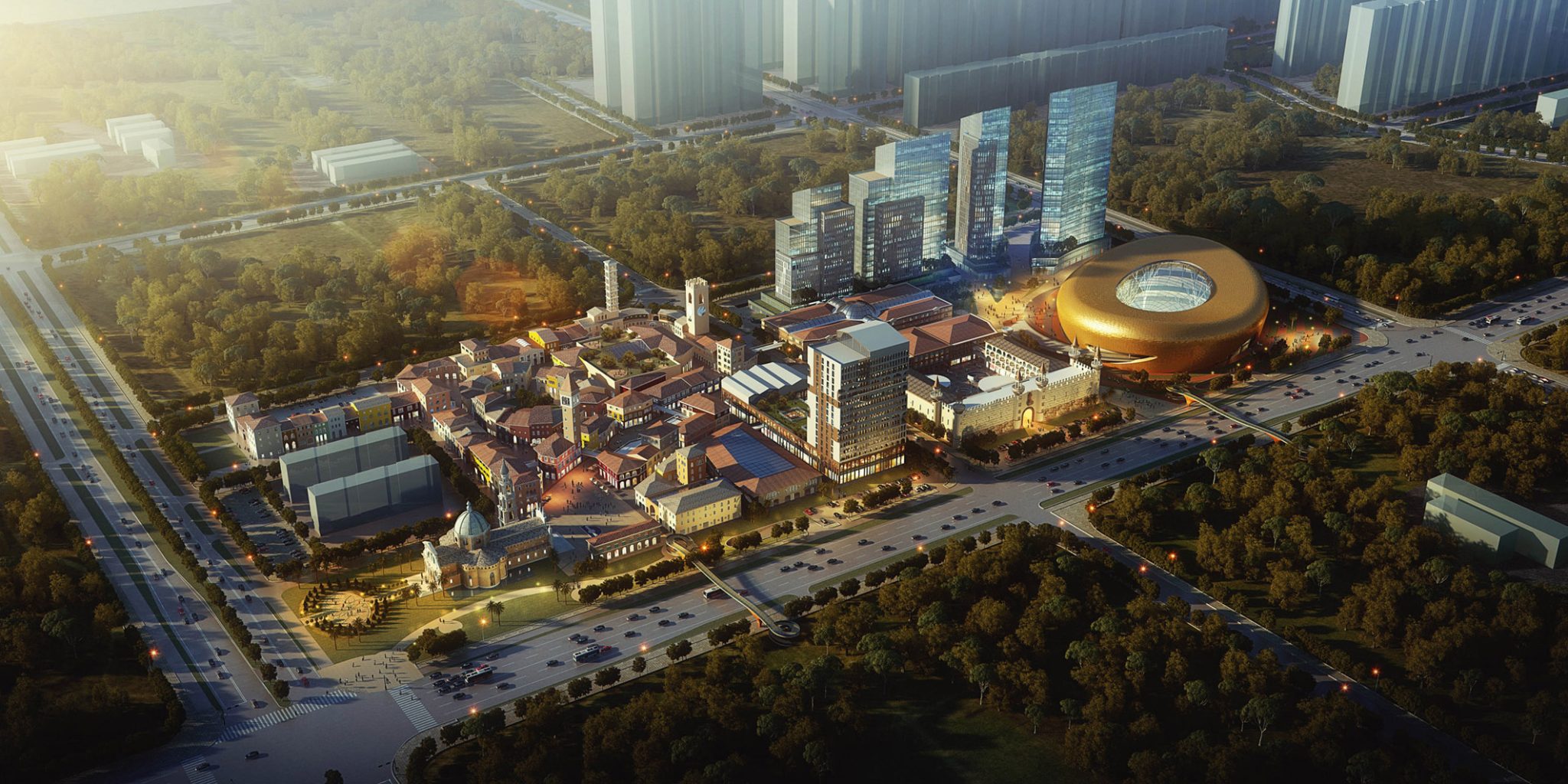 Suggestivo nel progetto l’incontro con elementi della tradizione cinese. L’idea cardine nasce intorno allo Yaun Bao, l’equivalente del nostro “lingotto” d’oro, un tempo utilizzato in Cina come valuta e oggi simbolo benaugurante di prosperità: alla sua forma è ispirato l’edificio principale, il Golden Center. Il secondo tema portante è la città italiana: saranno ricostruiti i caratteri tipologici e morfologici peculiari dell’architettura del Belpaese, dal tipico borgo toscano e marchigiano alla “calle” in stile veneziano, con elementi tipici del paesaggio urbano tra cui torri medievali, campanili e una chiesa.