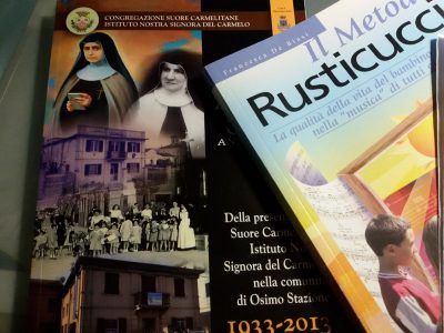 Il libro stampato nel 2013, commemorativo dei primi 80 anni della scuola cattolica Maria Mosca e l’edizione 2011 del Metodo Rusticucci a cui la didattica dell’asilo di Osimo si ispira