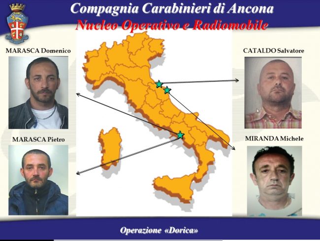 L’attività d’indagine coordinata dal procuratore Elisabetta Melotti, denominata “Operazione dorica”, è partita a giugno 2015 con la denuncia, ad Ancona, presentata da un cittadino alla caserma della Montagnola, per estrosione legata ad un mancato pagamento di droga. I militari del Norm e della Compagnia, guidati dal tenete Francesco Masile e dal capitano Fabio Ibba, sono arrivati in due anni ad effettuare 22 arresti complessivi in flagranza (l’ultimo appunto ieri a Chiaravalle) e gli ultimi quattro come ordinanze di custodia cautelare in carcere. Sequestrata droga per circa 33 chilogrammi tra cocaina e hashish. Il punto chiave delle indagini sono stati i fratelli Marasca. Si sarebbero avvalsi di numerosi corrieri e spacciatori per far arrivare la droga nell’Anconetano dove avevano ricavato anche due magazzini: uno al forno Totta di Montemarciano (culminato con l’arresto, il 26 ottobre del 2015, del titolare Paolo Totta e di un cliente, Attilio Zamporlini) e l’altro nell’attività di una parrucchiera di Chiaravalle (anche questo culminato con un arresto del 5 marzo 2016, quello della titolare dell’attività, Annalisa Passarelli, sorella dell’ultimo arresto in flagranza, trovata con oltre 20 chilogrammi di hashish e 350 grammi di cocaina). Per i viaggi avrebbero utilizzato anche il bus con la tratta Pompei-Ancona. I due fratelli, stando alle indagini, facevano la spola Napoli-Ancona per seguire i corrieri e presenziavano alle consegne con i grossisti, almeno due volte al mese. Sempre stando alle accuse mosse nei loro confronti, si avvalevano di metodi anche violenti per la riscossione dei pagamenti della droga. Quello più presente ad Ancona sarebbe stato Domenico, con un appartamento preso non a suo nome nella zona di Castelferretti e successivamente ospite del cognato Miranda. Per discutere sulle partite di droga da consegnare incontravano i loro clienti nei bar, in corso Stamira, o fuori dai due magazzini poi smantellati. I carabinieri, per seguire i loro spostamenti, sono arrivati anche a confondersi tra la clientela di ristoranti costosi, sempre nell’Anconetano, dove i fratelli, soprattutto Domenico, era solito mangiare. Il resto lo hanno fatto le intercettazioni ambientali e quelle telefoniche dove parlavano in codice usando le parole “calce” per indicare la droga o “ambulanza” ed “ospedale” quando qualcuno del giro veniva arrestato. Ad Ancona era il cognato Miranda che gestiva l’arrivo dello stupefacente. Dalla Campania il gruppo si era piazzato nell’Anconetano per presunti contatti che Domenico aveva costruito durante un periodo di detenzione nel carcere di Montacuto dove era finito a seguito di un arresto per droga, nel 2012. I fratelli Marasca si trovano ora in carcere a Napoli, Cataldo è in carcere a Pesaro mentre Miranda e nel carcere di Montacuto. Tutti e quattro sono accusati di detenzione e spaccio di sostanze stupefacenti in concorso.