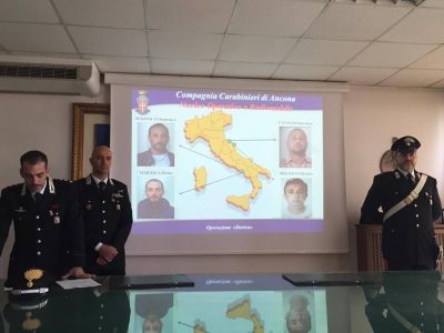 Il comandante della Compagnia dei carabinieri di Ancona Fabio Ibba e quello del Nucleo operativo Francesco Masile illustrano i risultati dell’operazione che ha portato agli ultimi 5 arresti