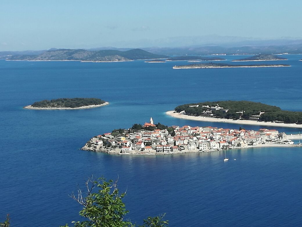 Una bella veduta aerea di Primosten, città turistica a nord della Dalmazia, e della statua della Madonna di Loreto che campeggia sul colle Gaj