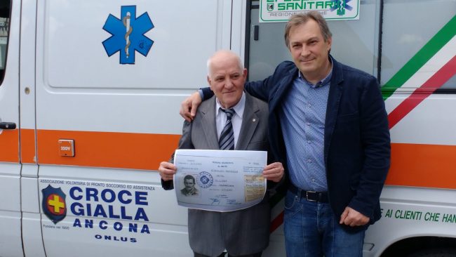 Gianfranco Bendelari con il presidente della Croce Gialla Alberto Caporalini. In mano la fotocopia della tessera storica di iscrizione
