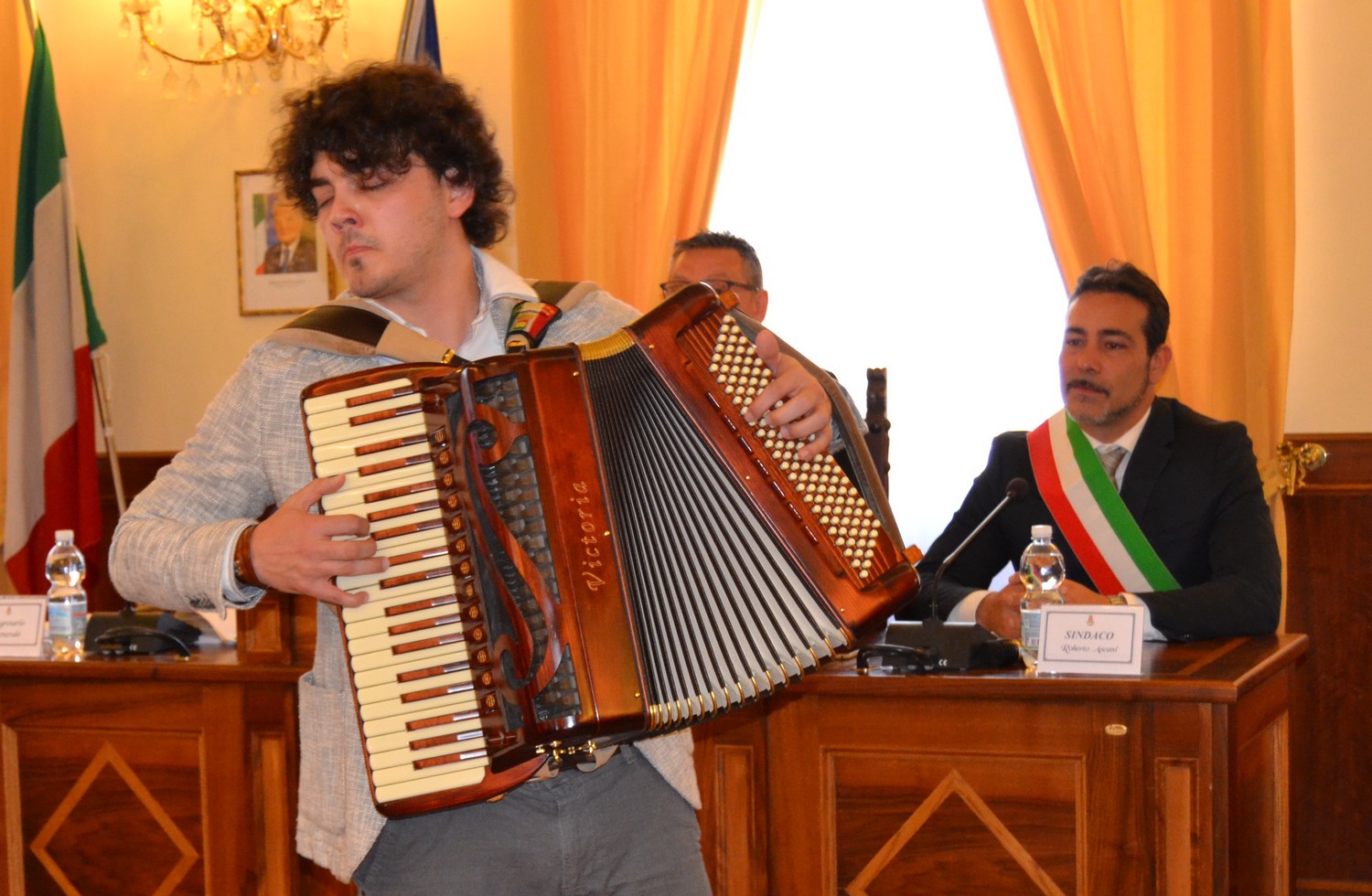 Una tradizione radicata e solenne, che quest’anno si è arricchita di una nuova “nomination”: l’ambasciatore della fisarmonica, testimonianza viva dello strumento di cui la città è culla. Antonino De Luca, giovane siciliano che non ha esitato a trasferirsi a Castelfidardo per assecondare la sua passione e che è si sta lanciando verso una carriera concertistica di livello assoluto, è il primo artista che con orgoglio se ne fregerà: l’Amministrazione, su intuizione del presidente del Museo Riccardo Serenelli, gli ha consegnato una mostrina da inserirsi sulla cinghia della fisarmonica per rappresentare la città ovunque suonerà. Le note vibranti e la commozione sincera di De Luca hanno offerto momenti di profonda intensità, vissuti anche al momento del conferimento delle altre benemerenze.
