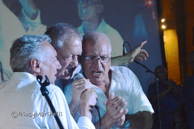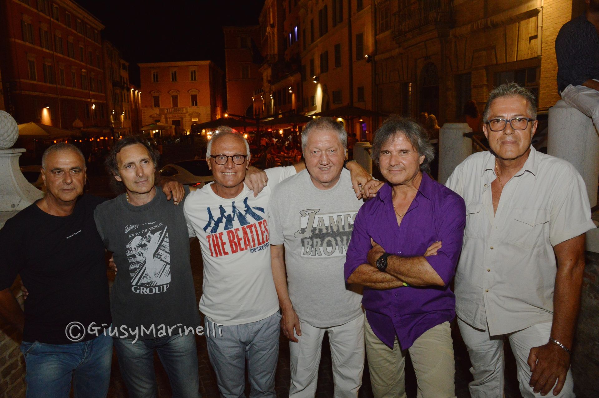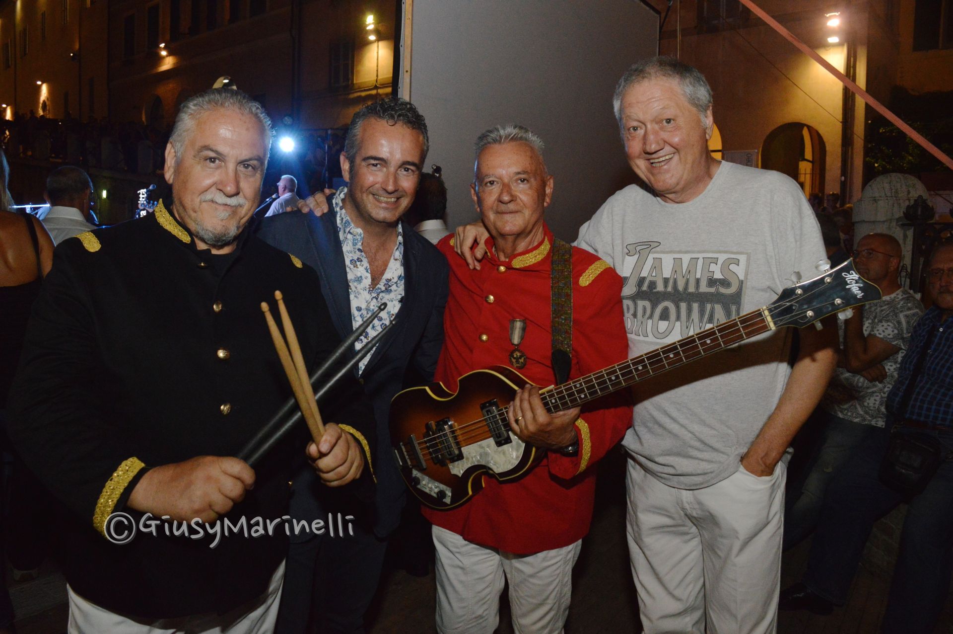 Enrico Ragni (a destra), al concerto di Ancona Beat di luglio 2015 con l’avvocato Stefano Spazzi e il gruppo I Pronipoti, con la giacca rossa Vladimiro Muti