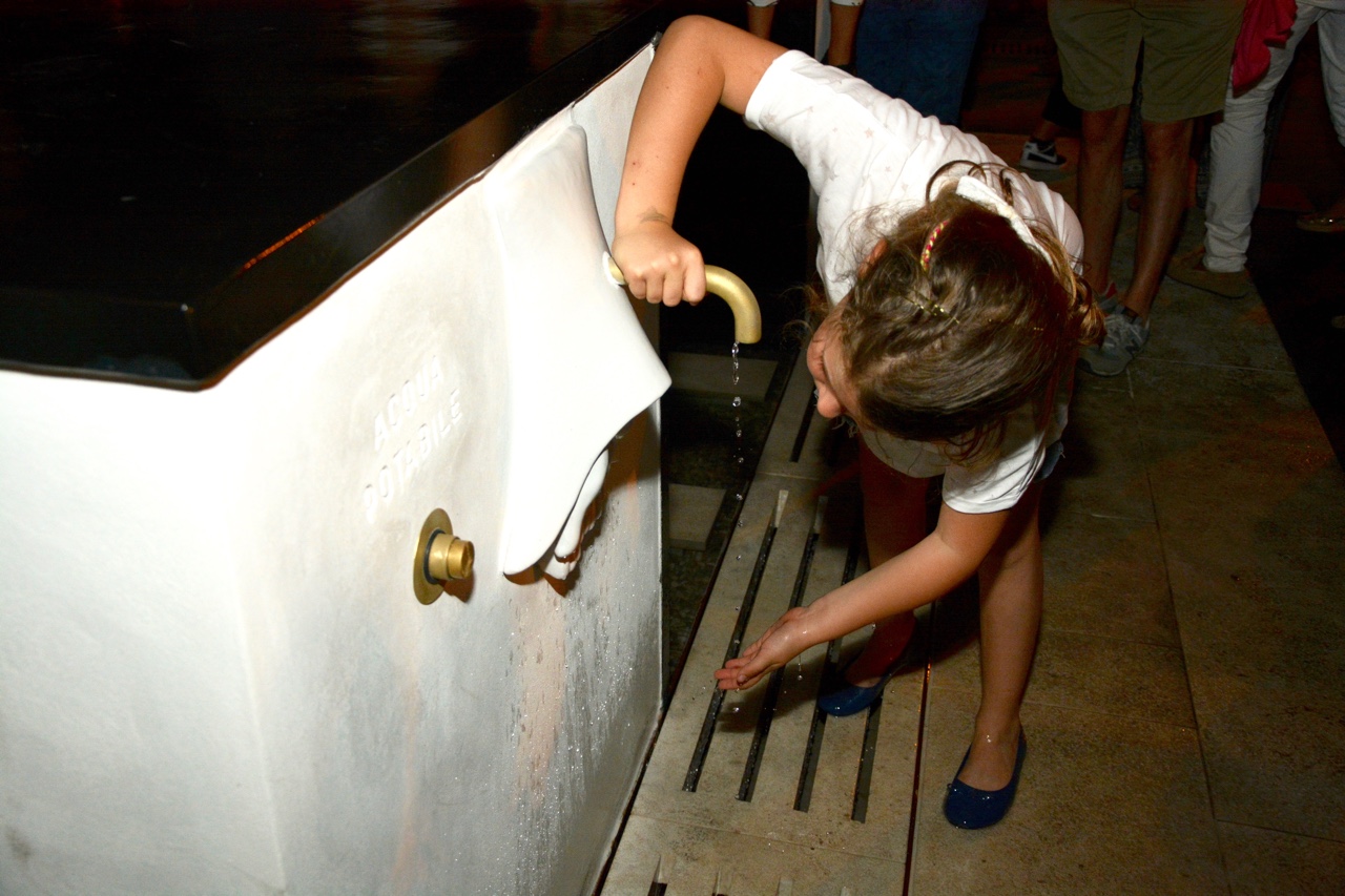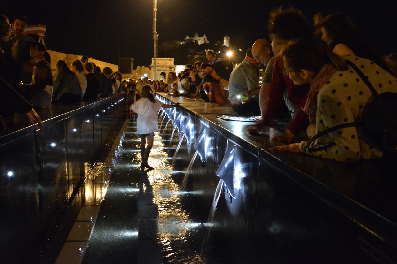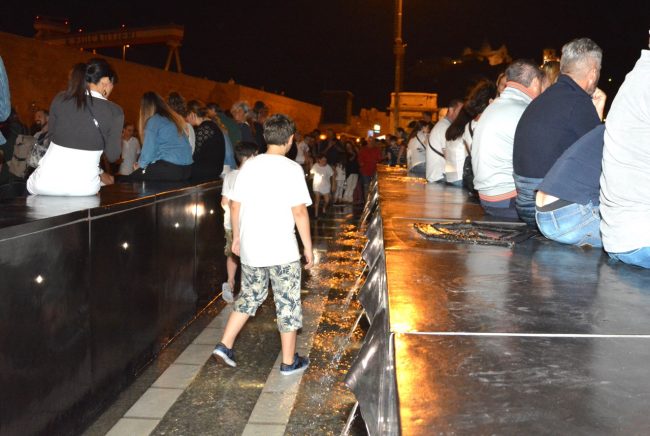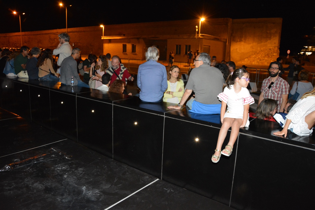 In tanti si sono assiepati al porto antico per sbirciarla e vederla per primi. Dopo settimane di annunci, anticipazioni e di attesa, la curiosità era forte. Tra detrattori ed entusiasti. E’ stata inaugurata giovedì sera alle 22 la fontana dei due soli di Enzo Cucchi al porto antico, sul molo Rizzo. Festa con giochi d’acqua, su uno schermo di acqua nebulizzata, come una nebbia, è stato proiettato il video di presentazione, prima di svelare finalmente l’opera completata, nascosta gelosamente sotto un telo durante la lavorazione iniziata a fine marzo. Poche parole davanti al pubblico da parte del maestro, che d’altra parte non è solito a troppi discorsi: Cucchi si è detto “fortunato” per aver avuto l’occasione di realizzare la scultura ed ha ringraziato la folla presente. Dopo anni di polemiche e incomprensioni (leggi l’articolo) è stata la serata della riconciliazione con il maestro della transavanguardia italiana di Morro d’Alba. L’opera è stata realizzata nelle parti in ceramica da parte di artigiani fiorentini, è lunga 15 metri e ricorda idealmente la monumentale fontana delle 13 Cannelle di corso Mazzini, con le sue 13 bocche d’acqua, di cui una di acqua dolce riciclata dal mare, le altre di acqua salata. Un simbolo moderno, nel cuore antico della città, quello del porto storico, solo di recente riscoperto e riappropriato. L’idea è quella di dare ai viaggiatori un punto di approdo e ristoro: la fontana infatti ha una passaggio centrale largo 1,4 metri che può anche essere percorso a piedi, largo abbastanza anche per le sedie a rotelle. Le bocche di acqua a forma di mani che ricevono sul palmo l’Agontano, la moneta battuta da Ancona all’epoca della repubblica marinara. I led luminosi installati all’interno della fontana rendono possibile la sua visione anche di notte. Il nome “i due soli”, richiama la caratteristica della città, l’alba e il tramonto sul mare. Costata 130mila euro, l’opera è stata finanziata a metà dall’Autorità portuale e dalla fondazione Cariverona, all’interno del progetto Mole.