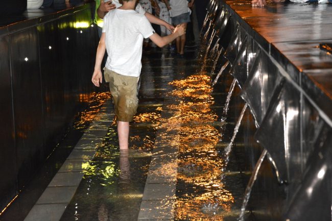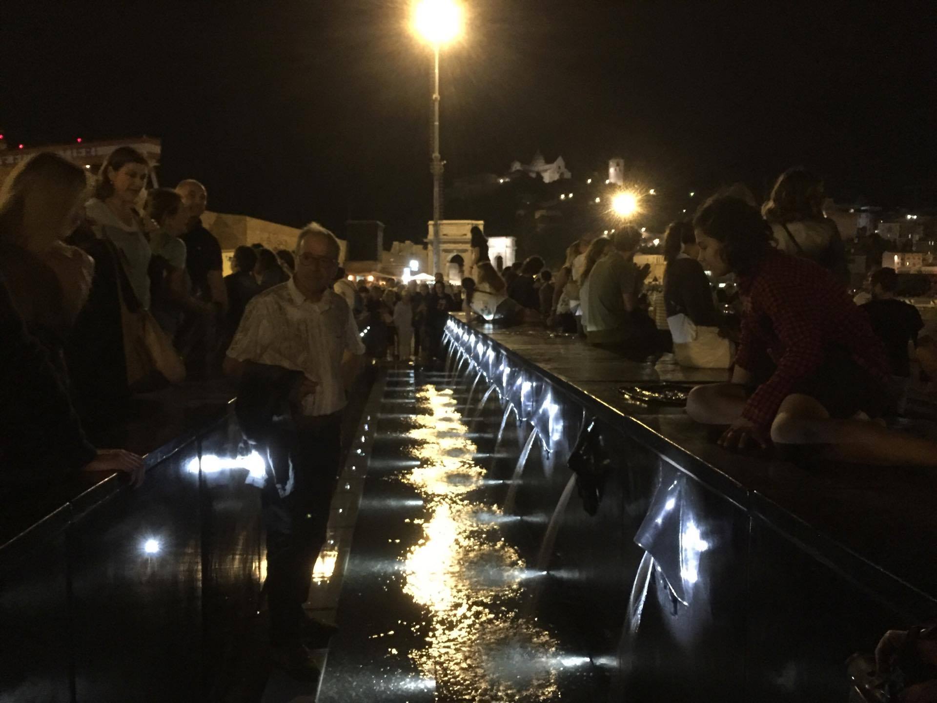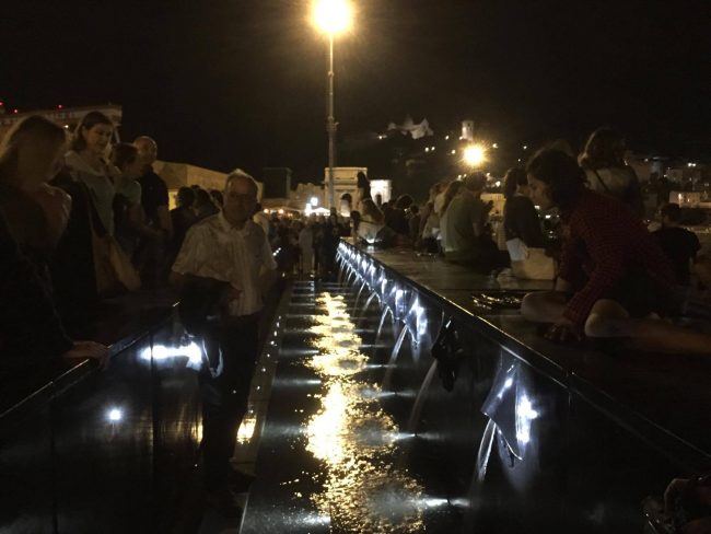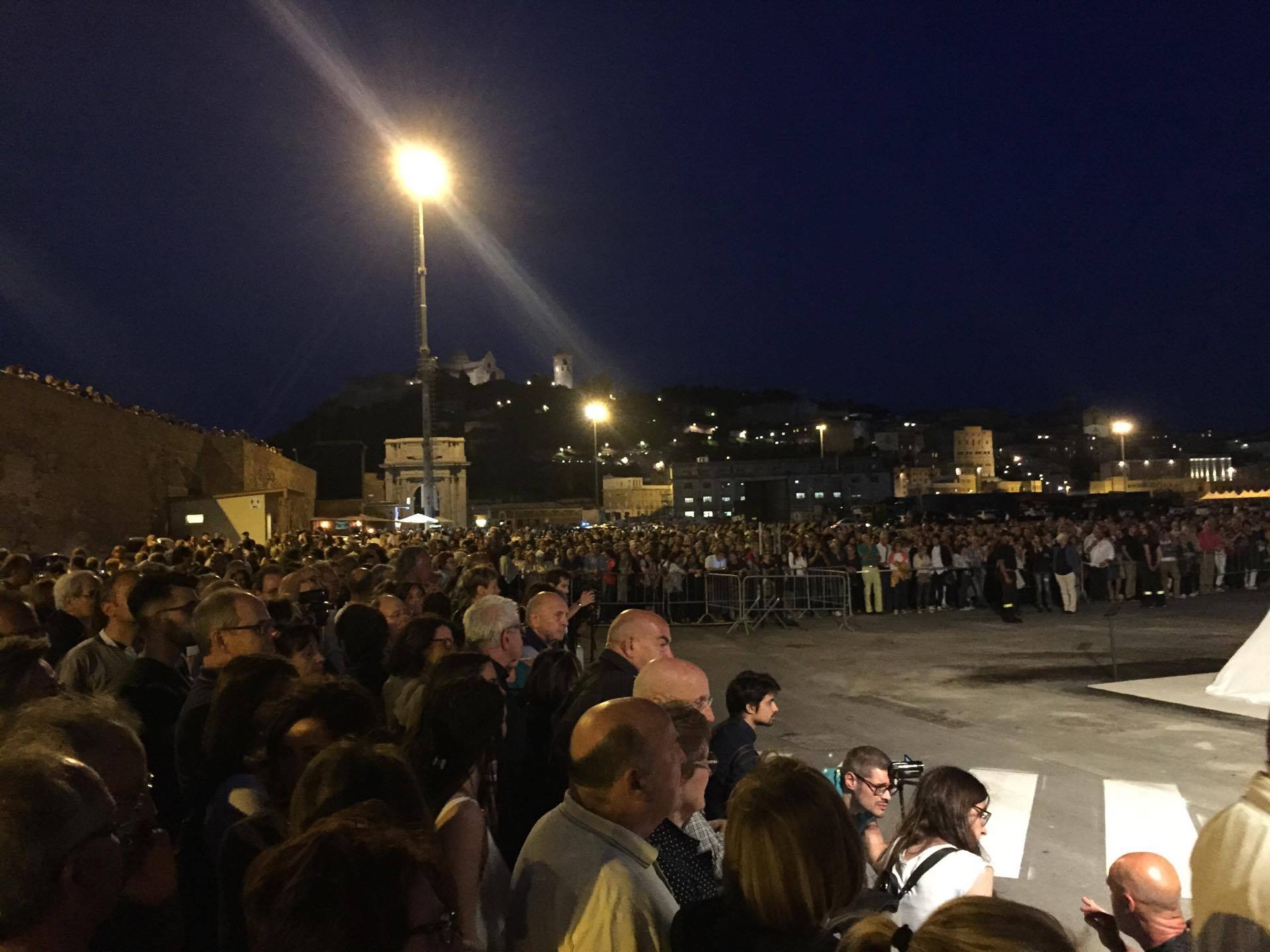 In tanti si sono assiepati al porto antico per sbirciarla e vederla per primi. Dopo settimane di annunci, anticipazioni e di attesa, la curiosità era forte. Tra detrattori ed entusiasti. E’ stata inaugurata giovedì sera alle 22 la fontana dei due soli di Enzo Cucchi al porto antico, sul molo Rizzo. Festa con giochi d’acqua, su uno schermo di acqua nebulizzata, come una nebbia, è stato proiettato il video di presentazione, prima di svelare finalmente l’opera completata, nascosta gelosamente sotto un telo durante la lavorazione iniziata a fine marzo. Poche parole davanti al pubblico da parte del maestro, che d’altra parte non è solito a troppi discorsi: Cucchi si è detto “fortunato” per aver avuto l’occasione di realizzare la scultura ed ha ringraziato la folla presente. Dopo anni di polemiche e incomprensioni (leggi l’articolo) è stata la serata della riconciliazione con il maestro della transavanguardia italiana di Morro d’Alba. L’opera è stata realizzata nelle parti in ceramica da parte di artigiani fiorentini, è lunga 15 metri e ricorda idealmente la monumentale fontana delle 13 Cannelle di corso Mazzini, con le sue 13 bocche d’acqua, di cui una di acqua dolce riciclata dal mare, le altre di acqua salata. Un simbolo moderno, nel cuore antico della città, quello del porto storico, solo di recente riscoperto e riappropriato. L’idea è quella di dare ai viaggiatori un punto di approdo e ristoro: la fontana infatti ha una passaggio centrale largo 1,4 metri che può anche essere percorso a piedi, largo abbastanza anche per le sedie a rotelle. Le bocche di acqua a forma di mani che ricevono sul palmo l’Agontano, la moneta battuta da Ancona all’epoca della repubblica marinara. I led luminosi installati all’interno della fontana rendono possibile la sua visione anche di notte. Il nome “i due soli”, richiama la caratteristica della città, l’alba e il tramonto sul mare. Costata 130mila euro, l’opera è stata finanziata a metà dall’Autorità portuale e dalla fondazione Cariverona, all’interno del progetto Mole.