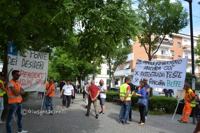 Striscioni di protesta tenuti a distanza dalle celebrazioni del due giugno, Festa della Repubblica italiana, “fondata sul lavoro”. Quello di cui si sentono scippati i dipendenti della ditta Baldini di Camerano, costretta allo stop produttivo (o quasi) dopo la decisione di Autostrade di dichiarare inagibile a mezzi superiori alle 12 tonnellate, l’unico ponte di accesso all’azienda (leggi l’articolo). Dopo il presidio al Passetto durante le celebrazioni per il 25 aprile, oggi (2 giugno) gli operai della Baldini sono tornati a manifestare in occasione del picchetto d’onore per la Festa della Repubblica, sempre al monumento ai Caduti. O meglio, ci hanno provato. I lavoratori non sono stati fatti avvicinare al luogo delle celebrazioni, bloccati dalla polizia all’altezza della farmacia del Viale. I manifestanti non hanno dato comunicazione alle forze dell’ordine della manifestazione, dunque, vietato passare.
