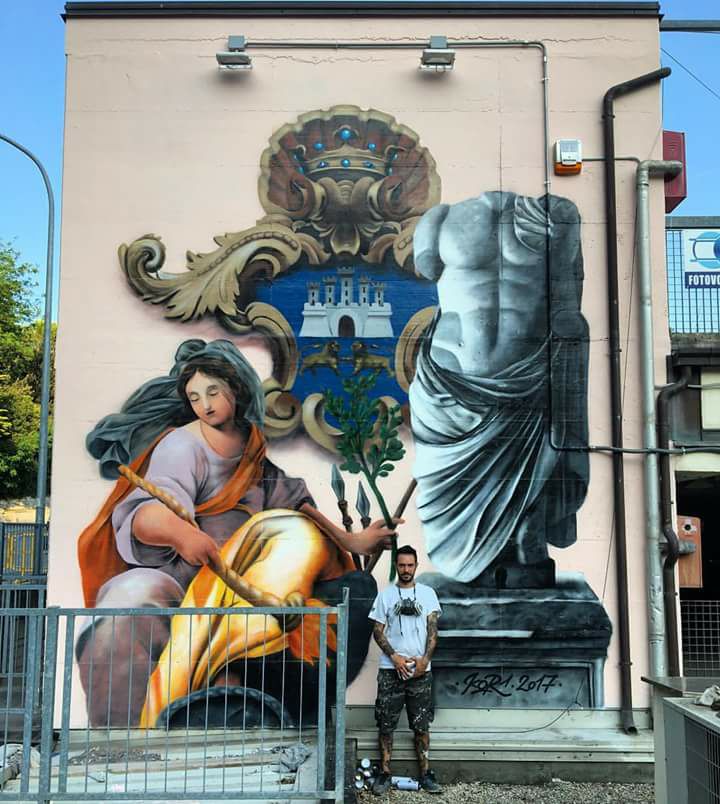 “Un ringraziamento particolare a Cristiano Pirani e al Maxiparcheggio”, firmato Federico Zenobi. Lo street artist jesino, 31 anni, ha commentato così il suo autoscatto sullo sfondo del suo ultimo lavoro dipinto sulla parete dell’infrastruttura di via Colombo gestita della Osimo Servizi Spa. “Omaggio a Osimo, spray su muro, 2017’ è già stato definitivo dall’amministrazione comunale un “capolavoro” che racchiude tutta le icone dell’Osimanità, “il simbolo della Vetus Auximon (le 5 torri dello stemma civico ndr), una statua acefala e l’immagine della Dea Pace, ripresa dai dipinti del Pomarancio presenti all’interno del piano nobile di Palazzo Gallo. Tutti elementi identificativi del nostro territorio e della nostra cultura. Ma sono in arrivo altre sorprese, sempre a firma del bravissimo Federico Zenobi”.