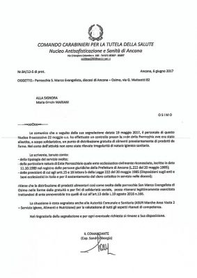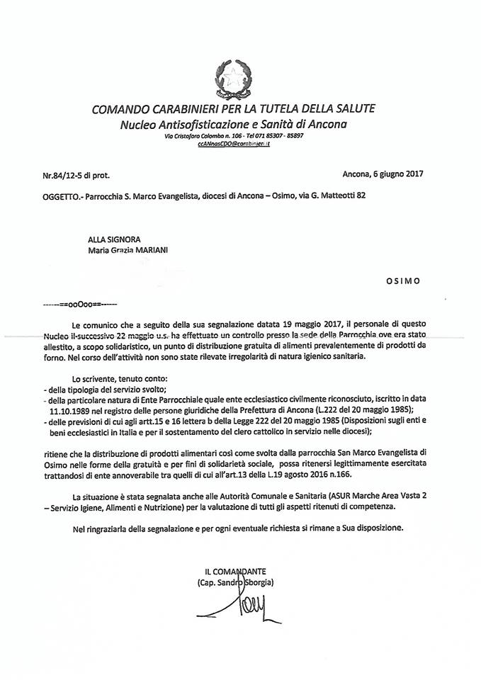 La distribuzione di prodotti alimentari così come svolta dalla parrocchia di San Marco Evangelista di Osimo, nelle forme della gratuità e per fini di solidarietà sociale, può ritenersi legittimamente esercitata trattandosi di un ente annoverabile tra quelli di cui all’articolo 13 della legge 166/2016”. Il chiarimento è arrivato con il resoconto ufficiale sull’attività d’indagine svolta dai carabinieri del Nas di Ancona, in una nota firmata dal capitano Sandro Sborgia ed inviata in risposta alla segnalazione, alla consigliera Maria Grazia Mariani (leggi l’articolo). Si è fatta luce anche sul locale di via Matteotti: appartiene alla Caritas ma è gestito direttamente dalla parrocchia da più di un decennio, da prima del 2014 quando è partito il servizio di distribuzione gratuita di prodotti da forno.