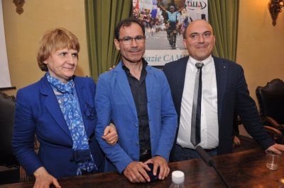 da sinistra la sindaca di Filottrano, Lauretta Giulioni, Davide Cassani, ct della Nazionale ciclismo ed il sindaco Simone Pugnaloni di Osimo alla presentazione della tappa osimana. Il primo premio osimano sarà dedicato al campione filottranese Michele Scarponi, scomparso lo scorso 22 aprile