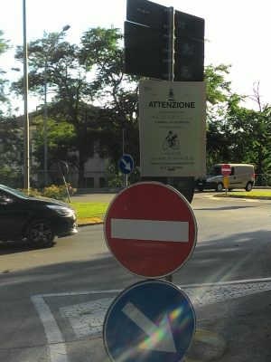 I cartelli stradali disseminati per le strade di Osimo con le indicazioni del percorso del Giro d’Italia U23
