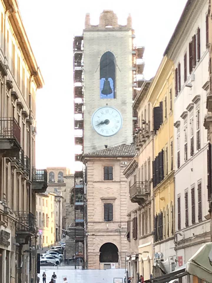 La torre civica di Osimo imbragata con le impalcature per i danni del sisma, da stamattina coperta con un telo artistico e molto realistico per coprire i tubi innocenti (foto Bruno Severini)