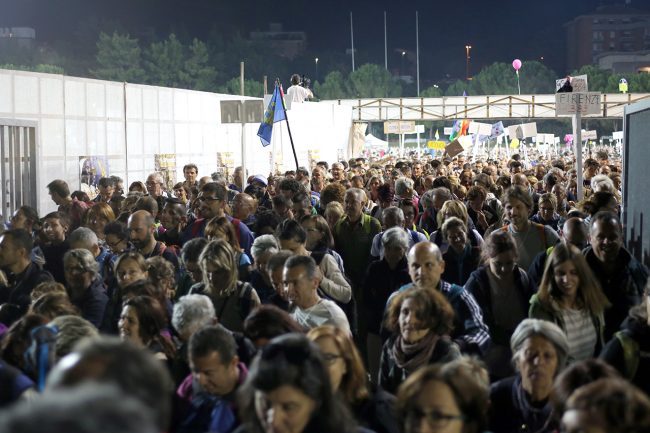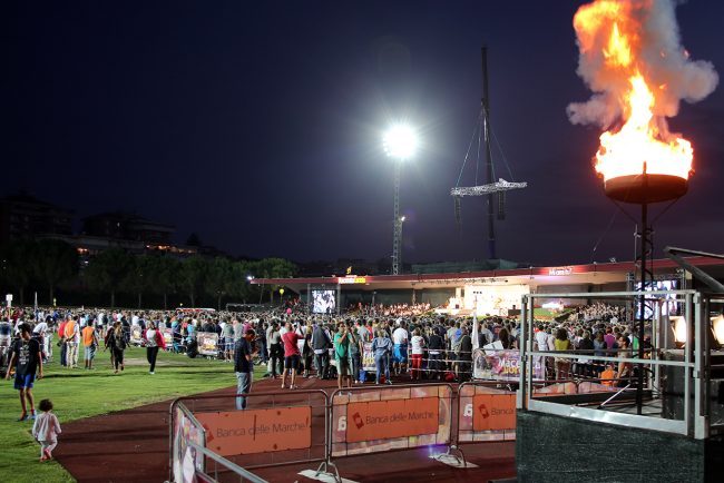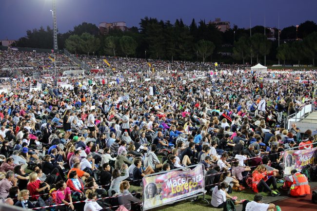 Arriva puntuale il saluto di papa Francesco ai pellegrini della Macerata Loreto a piedi. La sua voce si sovrappone e accompagna l’arrivo della fiaccola allo stadio Helvia Recina gremito e colorato. Un saluto molto veloce ma amichevole, come nel suo stile: «Voglio salutarvi alla partenza – ha detto – e augurarvi un buon pellegrinaggio. Io auguro che questa sera ognuno senta la voce di Gesù perchè “Mi ami tu?” è una frase a doppio senso. Buon pellegrinaggio a tutti». Nessuna risposta da parte del pontefice al sindaco Romano Carancini che nel suo consueto saluto di benvenuto aveva detto: «L’anno prossimo saranno 40 anni e il desiderio con cui passeremo questi 365 giorni è che il prossimo anno la forza, la grazia e la gloria ce le porti Francesco».