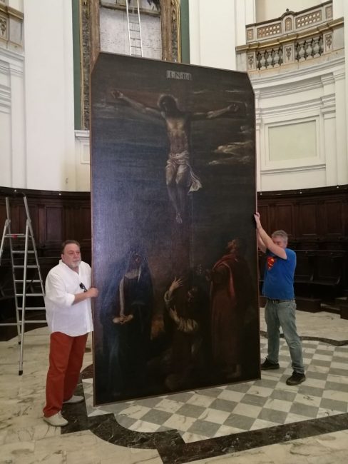 Il trasferimento della preziosa Crocifissione del Tiziano Vecellio, resa necessaria dal successivo posizionamento di una rete ampia quanto l’intero edificio di culto. Questa la delicata operazione compiuta stamattina dai carabinieri del Nucleo tutela patrimonio culturale (Ntpc) ad Ancona, in base alle direttive dell’Ufficio comunale Riqualificazione e arredo urbano-Edilizia storico monumentale diretto da Patrizia Piattelletti. E sotto l’attento sguardo di padre Giordano Bonecher, così affezionato al presente e soprattutto al futuro della chiesa di San Domenico, eretta tra il 1765 e il 1788 su progetto dell’architetto romano in posizione dominante su piazza del Plebiscito. L’intervento, durato complessivamente un paio d’ore, si è svolto senza intoppi.
