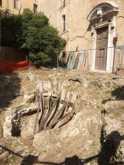 E’ un conto alla rovescia infinito, quello per la riapertura al pubblico della chiesa di San Bartolomeo-San Gregorio Armeno. Chiuso definitivamente nel 1972 perché devastato dal terremoto (per lo stesso motivo tre anni dopo furono demoliti i resti dell’attiguo convento), l’elegante edificio di culto, d’impianto architettonico cinquecentesco-settecentesco, che si affaccia su via Birarelli è stato alleggerito dalle impalcature del cantiere per la sua ristrutturazione già dal 2014-2015, dopo lavori a singhiozzo negli anni ’80, ’90 e inizio 2000. S’era ipotizzata una sua re-inaugurazione prima alla fine del 2015, poi entro il 2016. In realtà, forse, “il taglio del nastro potrà avvenire nel dicembre di quest’anno”, ha detto recentemente con scarsa convinzione il dirigente della nuova Soprintendenza unica per le Marche, Carlo Birrozzi. Perché? Bibliche lungaggini burocratiche a parte, l’ulteriore rinvio va addebitato ad una scoperta avvenuta oltre un paio d’anni fa proprio mentre venivano effettuati alcuni saggi nella zona del sagrato antistante la chiesa (anticamente un bellissimo giardino in stile armeno, oggi ridotto a un cumulo di erbacce e detriti edili): uno, due sopralluoghi, e i funzionari della Soprintendenza hanno ritrovato e studiato importanti tracce di un ulteriore e fino ad allora sconosciuto portale d’acceso all’Anfiteatro Romano (fine I sec. a.C – inizi I sec. d.C.), su parte del quale fu eretta la chiesa nel 1522 e la cui parte ricavata dagli scavi si estende immediatamente contigua alla sua sinistra. Ne scaturì un dibattito-confronto fra i vertici delle istituzioni competenti: la dott.ssa Giorgia Muratori, insediatasi nel marzo 2015 a capo del Segretariato regionale del ministero Beni e attività culturali e del Turismo (Mibact), l’allora soprintendente all’Archeologia Mario Pagano e poi, dall’estate scorsa, il suo successore (dopo l’unificazione della Soprintendenza Archeologia con quella ai Beni culturali e al paesaggio) Carlo Birrozzi.
