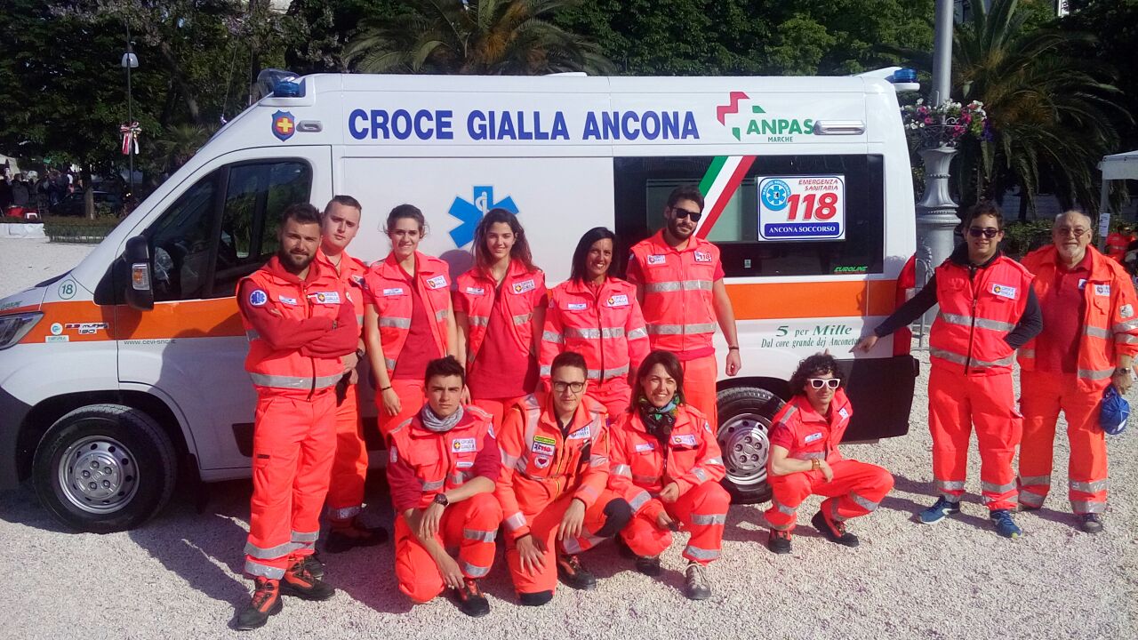 I volontari della Croce Gialla di Ancona con il mezzo donato dal 5 per mille dell’Irpef degli anconetani durante la festa di San Ciriaco