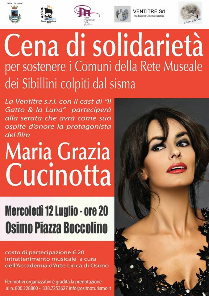 Una cena di beneficenza, il prossimo 12 luglio in piazza Boccolino, per sostenere la Rete Museale dei Sibillini e i territori colpiti dal sisma. Alla conviviale parteciperà anche l’attrice Maria Grazia Cucinotta, protagonista del film ‘Il Gatto e la Luna’ (leggi l’articolo) e tutta la troupe del regista Lippolis e dell’attore-produttore Enzo Storico presto ad Osimo per girare le scene. Il casting del thriller poliziesco-sentimentale si è arricchito proprio ieri di altri attori amati dal pubblico, come Edy Angelillo e Philippe Leroy. Tutti possono partecipare (costo 20 euro) prenotando un posto a tavola per questa conviviale sotto le stelle contattando i numeri 800.228800 oppure 338 7253627. E’ una delle novità che riserva il cartellone delle manifestazioni estive della città dei senza testa quest’anno.
