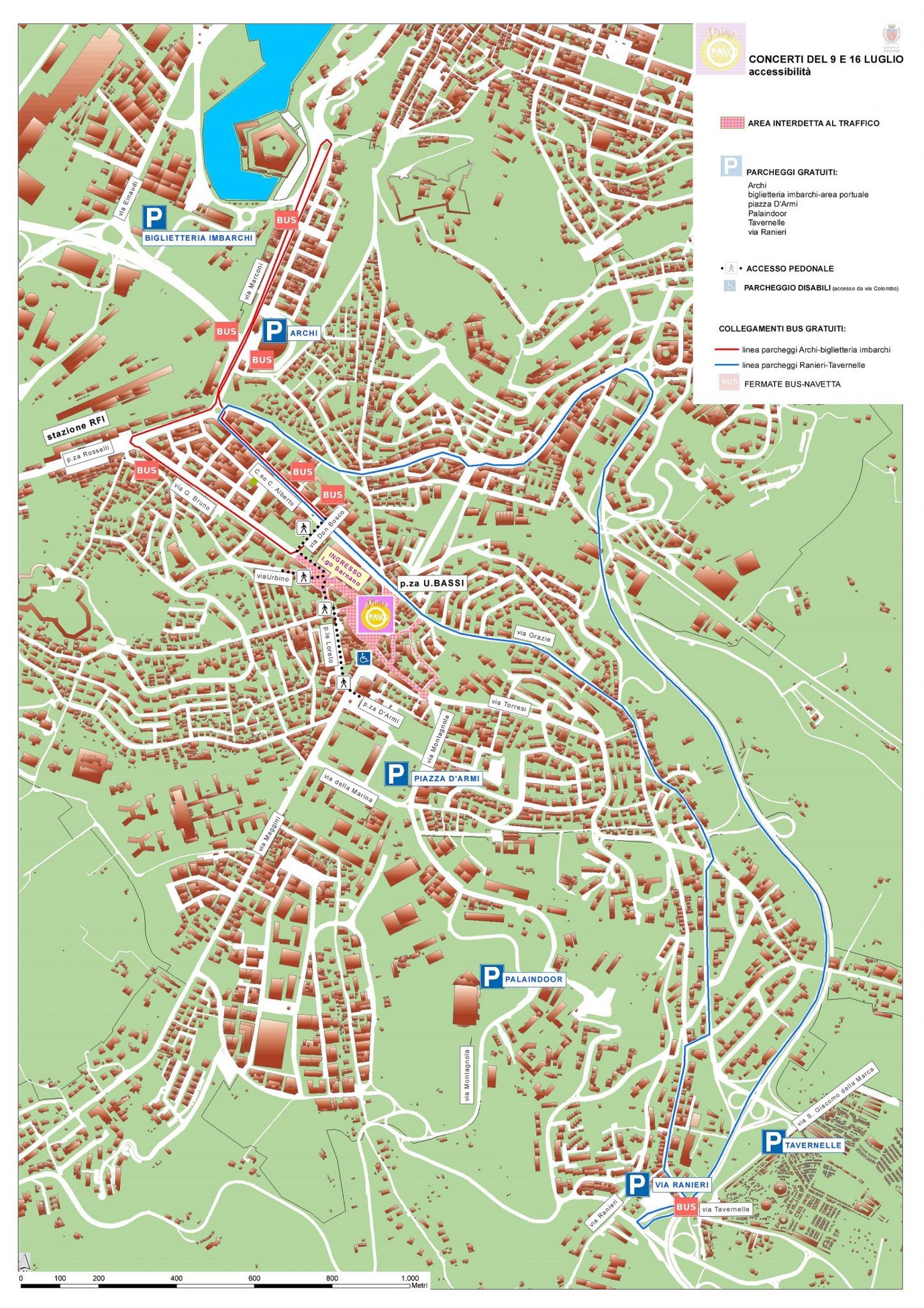 Parcheggi e bus. Servizio navetta gratuito per domenica 9 luglio e domenica 16 luglio, a supporto dei parcheggi Archi (apertura straordinaria e gratuita dalle ore 18) e Tavernelle (centro scambiatore via Ranieri e park Cimitero).