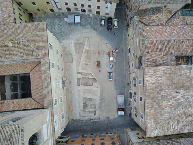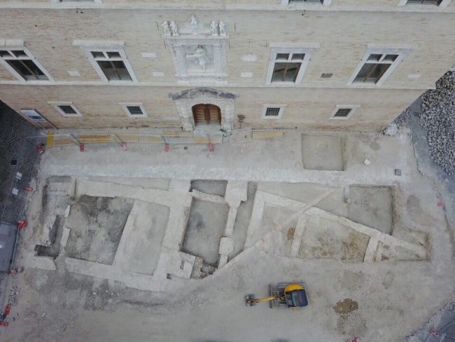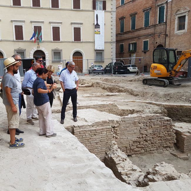 Sito archeologico di piazza Colocci, il sopralluogo di Soprintendenza e Comune conferma il valore dei ritrovamenti e gli enti si sono trovati d’accordo nel volere approfondire con rilievi stratigrafici e planimetrici, da eseguire in tempi brevi, per poter stabilire l’esatta datazione delle mura medievali riemerse dal sottosuolo. È il risultato dal nuovo sopralluogo effettuato dall’ispettore di Jesi della Soprintendenza delle Marche Maria Raffaella Ciuccarelli e dagli assessori ai lavori pubblici Roberto Renzi e alla cultura Luca Butini. Già da ora è possibile rilevare due distinte fasi storiche nelle opere murarie emerse e il taglio netto a livello della base della piazza che testimonia una chiara e decisa volontà del potere municipale di allora di ricavare uno spazio aperto davanti al futuro palazzo della Signoria che si stava per realizzare. Ad oggi non ci sono chiare testimonianze di questo periodo storico di Jesi e dunque l’area diventa un caso studio importante per ricostruire l’assetto urbanistico del tempo e, più in generale, la storia della città. Tra l’altro le dimensioni delle murature emerse stanno a testimoniare l’importanza degli edifici che non erano sicuramente di abitazioni povere o comuni. Di modesto rilievo, invece, gli altri reperti ritrovati, riconducibili per lo più a frammenti di utensili da cucina.