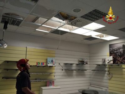 MALTEMPO - A Serra de Conti l'albero secolare, con un tronco dal diamentro di oltre un metro, è piombato su via San Paterniano. A Castelplanio infiltrazioni d'acqua dal tetto dello shopping center Oceano fanno cadere elementi del controsoffitto