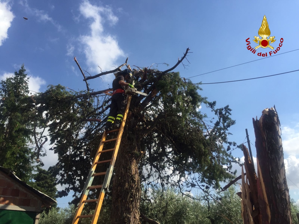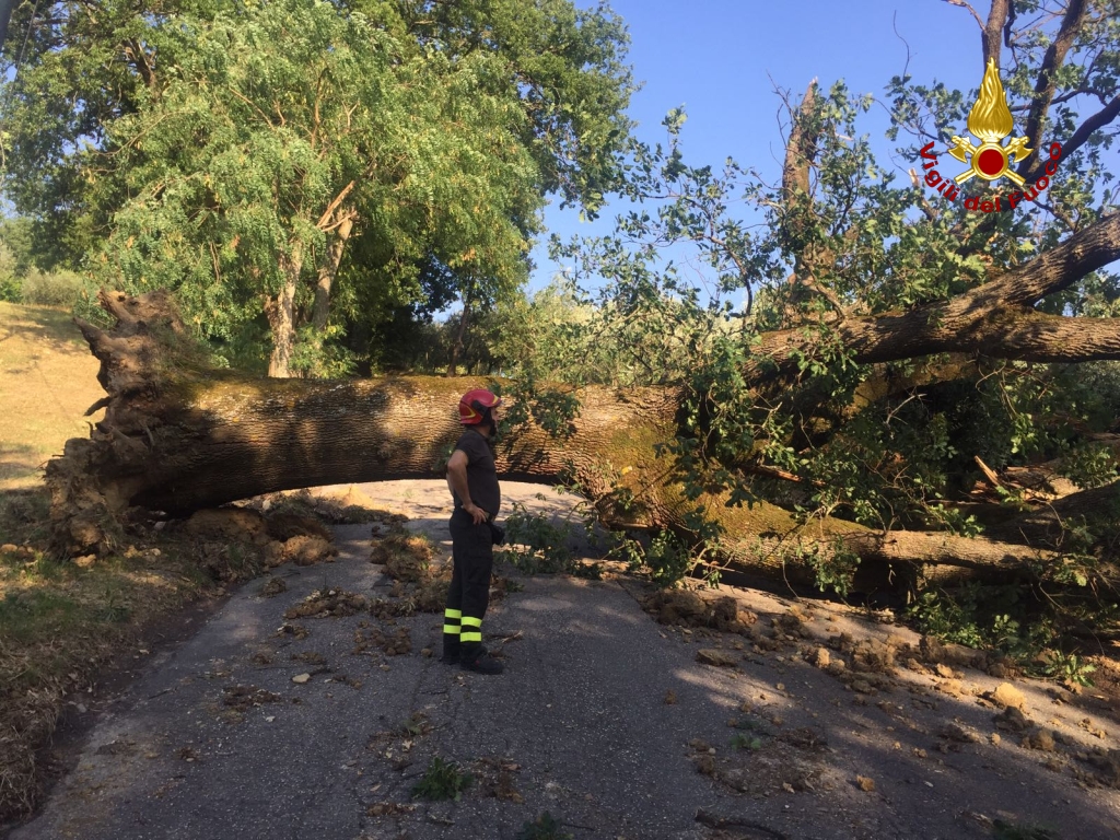 Alberi sull’asfalto e rami spezzati dalla tromba d’aria e la grandinata che oggi pomeriggio ha colpito l’entroterra anconetano. A Serra de’ Conti i vigili del fuoco del comando di Senigallia sono intervenuti nel primo pomeriggio per alcune piante cadute sulla strada a causa del maltempo, in particolare per una quercia centenaria con il tronco dal dimaetro di 1,5 metri che si è abbattuta su via San Paterniano.