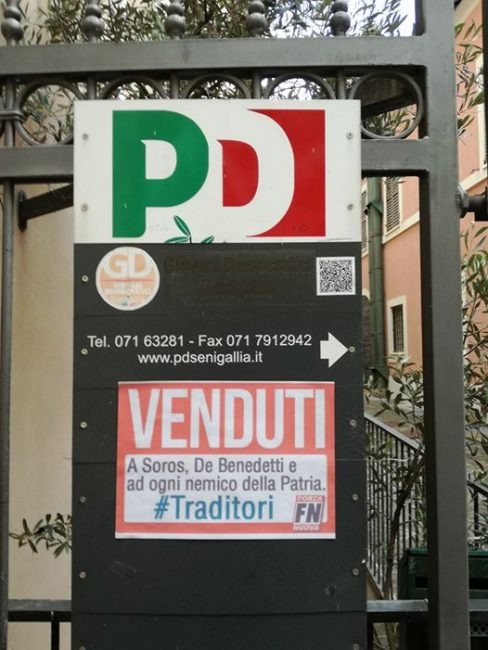 Un manifesto con la scritta “Venduti” e il simbolo di Forza Nuova è stato scoperto domenica mattina al circolo Pd di Senigallia di via Arsili. A denunciare l’affissione è stata il segretario comunale Elisabetta Allegrezza, che oggi ha riceve la solidarietà di segretario regionale Francesco Comi e del capogruppo regionale Fabio Urbinati. «Un’azione dimostrativa di carattere nazionale quella messa in scena dai militanti della formazione di estrema destra contro il Pd. Manifesto la mia profonda solidarietà ai circoli ed alle sedi di partito colpite da quest’attacco di natura intimidatoria. Questo gruppo di estrema destra conferma la propria vigliaccheria, agendo di nascosto, approfittando della notte per affiggere cartelli di attacco al nostro partito” scrive Comi. «Non ci lasceremo intimidire. Siamo accanto al segretario e a tutto il Pd di Senigallia» aggiunge il capogruppo Fabio Urbinati. «Esprimiamo solidarietà al segretario Elisabetta Allegrezza e a tutto il partito di Senigallia – continua Urbinati – e ci uniamo alle dichiarazioni del nostro segretario regionale, Francesco Comi. Non ci piegheremo a tali atti vili. Non ci lasceremo intimidire».
