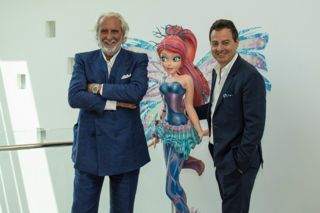 Da sinistra Maurizio Totti e Iginio Straffi con Bloom, una delle celebri fatine create dall’immaginazione di Straffi e dallo studio di animazione di Loreto