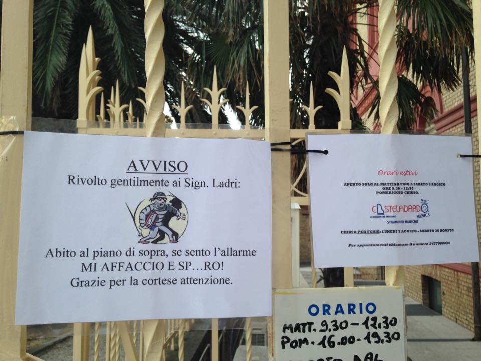 Chi lo conosce, sa bene che M.M., 63 anni, è il negoziante più buono e paziente del mondo. Ma qualche volta anche la tolleranza ha un limite e dopo aver subito tanti piccoli furti di merce, in orario di apertura, nel suo negozio di strumenti musicali, il commerciante ha pensato di giocare d’astuzia, sistemando un cartello minaccioso, con una frase-choc, sulla cancellata d’ingresso del suo punto vendita a Castelfidardo: “Abito al piano di sopra, se sento l’allarme mi affaccio e sp..ro”. E’ tempo di ferie estive e l’obiettivo sarebbe quello di intimidire “i ladri seri, quelli che vengono di notte e ti portano via quasi tutto. Quel cartello – spiega lui stesso – l’ho messo per evitare di dover sparare addosso ai ladri che sono persone quasi come noi”.