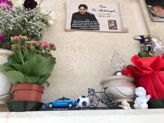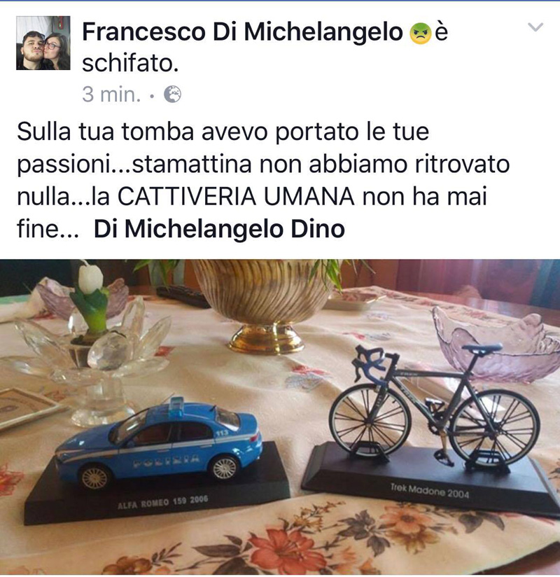 La notizia del furto ha sollevato l’indignazione generale anche nella città dei senza testa. L’altro ieri dalla tomba di Dino sono scomparsi i due oggetti ma non è stato toccato invece il piccolo pallone, l’altra grande passione del poliziotto. Il post di Francesco di Michelangelo sui social ha scatenato la reazioni di risentimento vivo non per il valore economico dei modellini rubati ma per quello affettivo. La scoperta del furto è stata fatta dalla madre di Dino, dopo essersi recata al cimitero per deporre dei fiori sulla tomba. “Dopo aver scoperto che i due oggetti erano spariti, in lacrime e’ stata soccorsa e aiutata a riprendersi dal fioraio che è accorso da lei quando l’ha sentita piangere – racconta la famiglia Di Michelangelo – Purtroppo la piaga dei furti è molto diffusa al cimitero di Chieti sopratutto nell’ala nuova dove riposano Dino e Marina. La polizia municipale ha intensificato i controlli già da tempo per combattere questo triste fenomeno. Gli oggetti trafugati rappresentavano le passioni di Dino: la sua amata volante e la sua bici da corsa. Erano dei modellini fatti fare e richiesti a Milano da una ditta specializzata che non aveva esitato a farceli avere appena saputo che erano destinati ala tomba di Dino. Lui aveva lavorato a Milano per anni”.
