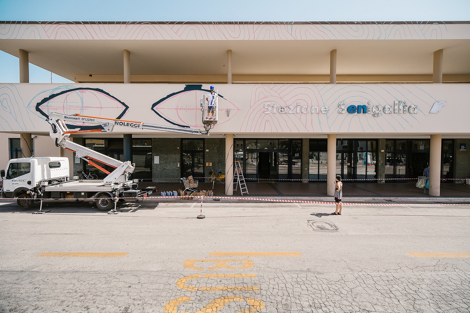 Al centro della composizione, le figure di uno sguardo e di due occhi che accompagneranno migliaia di persone in transito dalla stazione ferroviaria. “Ancora una volta – sottolinea il sindaco Maurizio Mangialardi – Senigallia si caratterizza per l’originalità e qualità delle proposte culturali e per la capacità di promuovere percorsi artistici urbani capaci di esaltare la bellezza dei nostri spazi e monumenti. Ringrazio di cuore i nostri partner per aver scelto Senigallia per un progetto di rilievo nazionale che contribuirà alla promozione dell’immagine di Senigallia come città d’arte”. L’opera prevede anche il supporto di hotel e ristoranti della città che hanno messo a disposizione le risorse sposando il progetto e sostenendo la creatività.