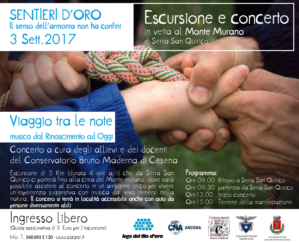 Da Serra San Quirico alla vetta del Monte Murano. L’appuntamento è per domenica 3 settembre con il concerto dei musicisti del Conservatorio Bruno Maderno all’arrivo. L’escursione partirà dall’abitato di Serra San Quirico la mattina alle 9.30 (iscrizioni in Piazza della Libertà) e, attraverso il sentiero, raggiungerà la cima del Monte Murano, da dove si potrà godere di un panorama mozzafiato su tutta la Vallesina e fino al mare. Si terrà in vetta il concerto dei docenti e allievi del Conservatorio di Cesena. Il concerto proporrà un susseguirsi di brani che spazieranno dalla musica rinascimentale fino alle colonne sonore dei film di oggi. All’escursione e al concerto saranno presenti anche gli amici della Lega del Filo D’Oro. Per tutti i partecipanti questa sarà l’occasione per fare una esperienza unica, per godere della montagna e della musica. Alle 15 il rientro. Con l’escursione che durerà 2 ore all’andata e 2 al ritorno si affronterà un dislivello di 450 metri.