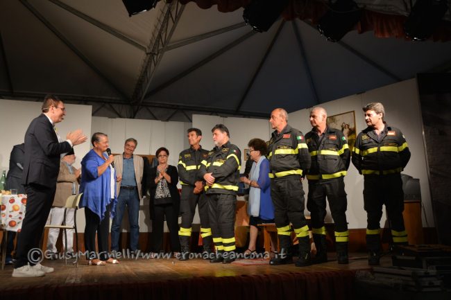 Il Festival del dialetto di Varano si è aperto nel segno della solidarietà con il riconoscimento a chi si è speso in prima linea per salvare vite umane durante i giorni più drammatici del sisma di un anno fa. Il premio al personaggio marchigiano quest’anno è andato al Gruppo dei Vigili del Fuoco di Ancona che giusto un anno fa era operativo sui luoghi del terremoto. Un lungo applauso ha accolto l’ingresso sul palco del comandante provinciale Giovanni Di Iorio e di alcuni componenti la squadra (Roberto Balerci, Romano Mozzoni, Umberto Mazzanti, Graziano Piombetti e Daniele Grechi) che sono stati premiati e ringraziati dal presidente del Comitato Manifestazioni Varanesi Lucia Gioia, dal sindaco Valeria Mancinelli e dal vice sindaco Pierpaolo Sediari. “Non siamo eroi né angeli – ha detto il comandante Di Iorio – ma persone che svolgono il proprio mestiere come una missione. Quando siamo arrivati ad Arquata abbiamo trovato tante persone sotto le macerie ed abbiamo contribuito a salvarne qualcuna. Il rammarico è che se fossimo arrivati prima si sarebbero potute salvare altre vite. Sono stati momenti concitati e particolari – ha proseguito – ma da subito si è sviluppata la speranza di poter recuperare più persone possibili e guardare con speranza al futuro”.