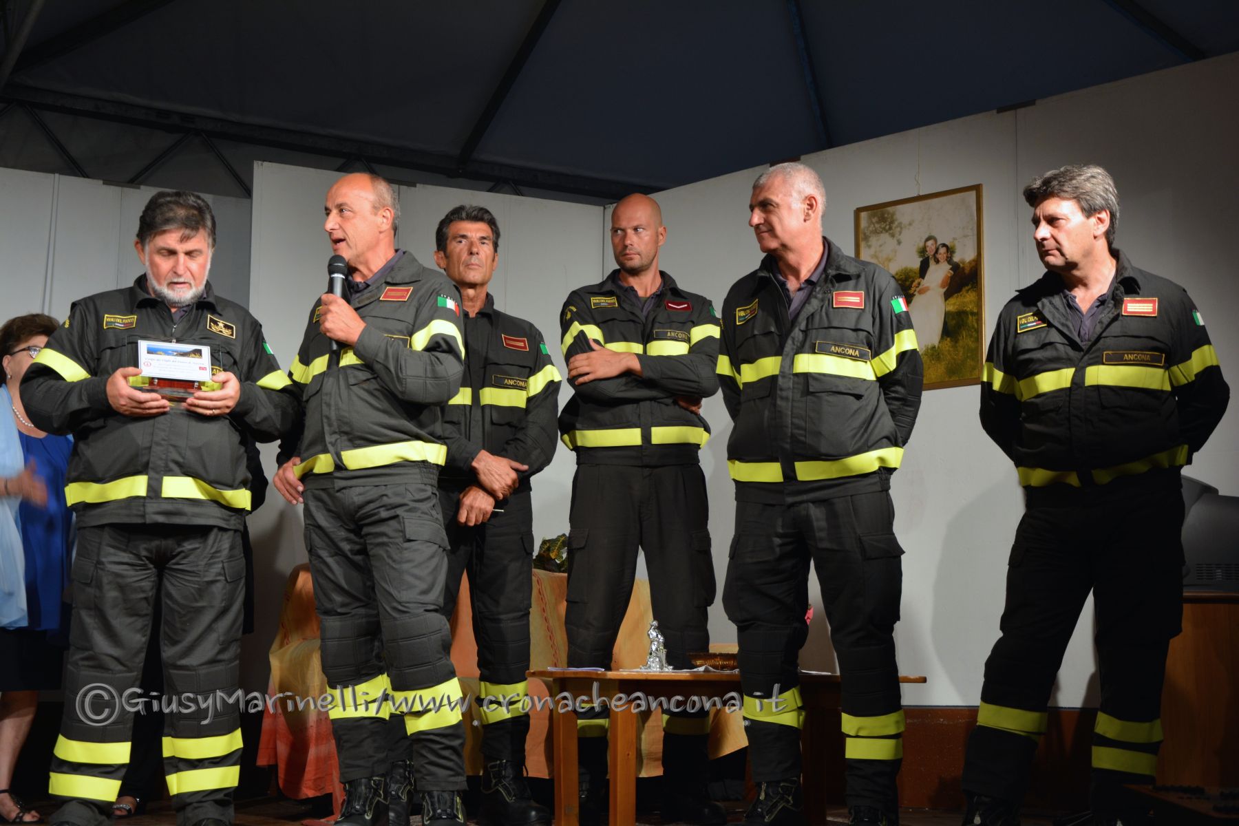 Il comandante Di Iorio (il primo a sinistra) con alcuni vigili del fuoco del comando di Ancona ricevono il premio marchigiano dell’anno del Festival di Varano