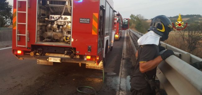 Incendio di sterpaglie ai margini della superstrada Sp 76, su entrambe le corsie di marcia, nel tratto che attraversa l’area di Pian del Medico. L’allarme è scattato alle 18.40 e sul posto sta operando una squadra dei vigili del fuoco di Jesi mentre le pattuglie della polizia locale, su disposizione della Polstrada di Jesi e in via precauzionale, hanno provveduto a chiudere al transito uno spezzone dell’arteria a scorrimento veloce compreso tra le uscite di Jesi centro e Jesi ovest.