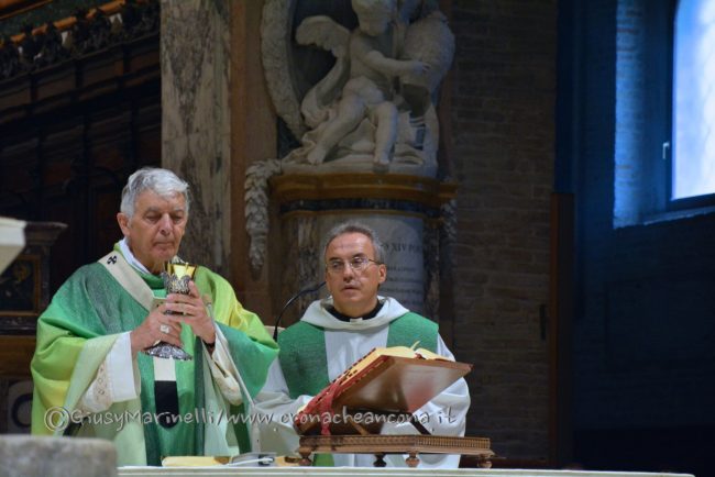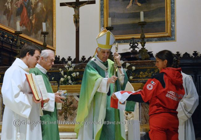 È don Dino Cecconi, cappellano del porto, a chiedere ai fedeli di sedersi ancora un attimo prima della benedizione per ringraziare Menichelli «per quello che ha fatto in questi tredici anni. Il suo supporto ed il suo impegno è stato grande per la città, per il mare e per gli uomini di mare. Oggi il tempo non ce l’ha permesso − aggiunge − ma non tralasceremo l’omaggio in mare ai caduti». Possibile, dunque, il rinvio della processione in mare e della festa al porto antico, previste per oggi pomeriggio ed annullate per il maltempo, insieme alla sorpresa organizzata dall’associazione Stella Maris e dal Comune per salutare ufficialmente il cardinale, che potrebbe lasciare Ancona i primi di ottobre per passare il testimone a don Angelo Spina.