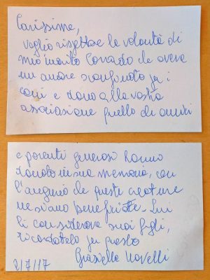 “Quando abbiamo letto il biglietto ci siamo commosse per questo atto inaspettato di altruismo – raccontano le volontarie di ‘Cuori Pelosi’- La nostra associazione è nata un po’ per caso da pochi mesi. Lo scorso dicembre abbiamo iniziato a parlare dei nostri animali con una pagina facebook. Poi viste le adesioni, ci siamo costituiti in associazione e oltre a gestire il canile sanitario di via Arceviese, in questi primi 9 mesi di vita abbiamo già organizzato diverse manifestazioni per sensibilizzare l’opinione pubblica al problema delle adozioni. Al nostro interno opera anche un educatore cinofilo”.