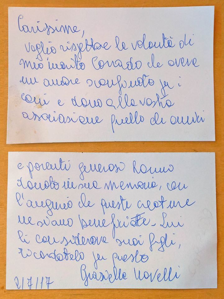 Pochi giorni fa alle volontarie dell’associazione ‘Cuori Pelosi’ di Senigallia è stata recapitata una lettera a firma della signora Graziella, con il denaro e poche ma toccanti parole: “Voglio rispettare le volontà di mio marito Corrado che aveva un amore sconfinato per i cani e dono alla vostra associazione quello che amici e parenti generosi hanno donato in sua memoria, con l’augurio che queste creature ne possano beneficiare”. La donazione contribuirà a far crescere il fondo destinato anche alla costruzione di un gattile sanitario.