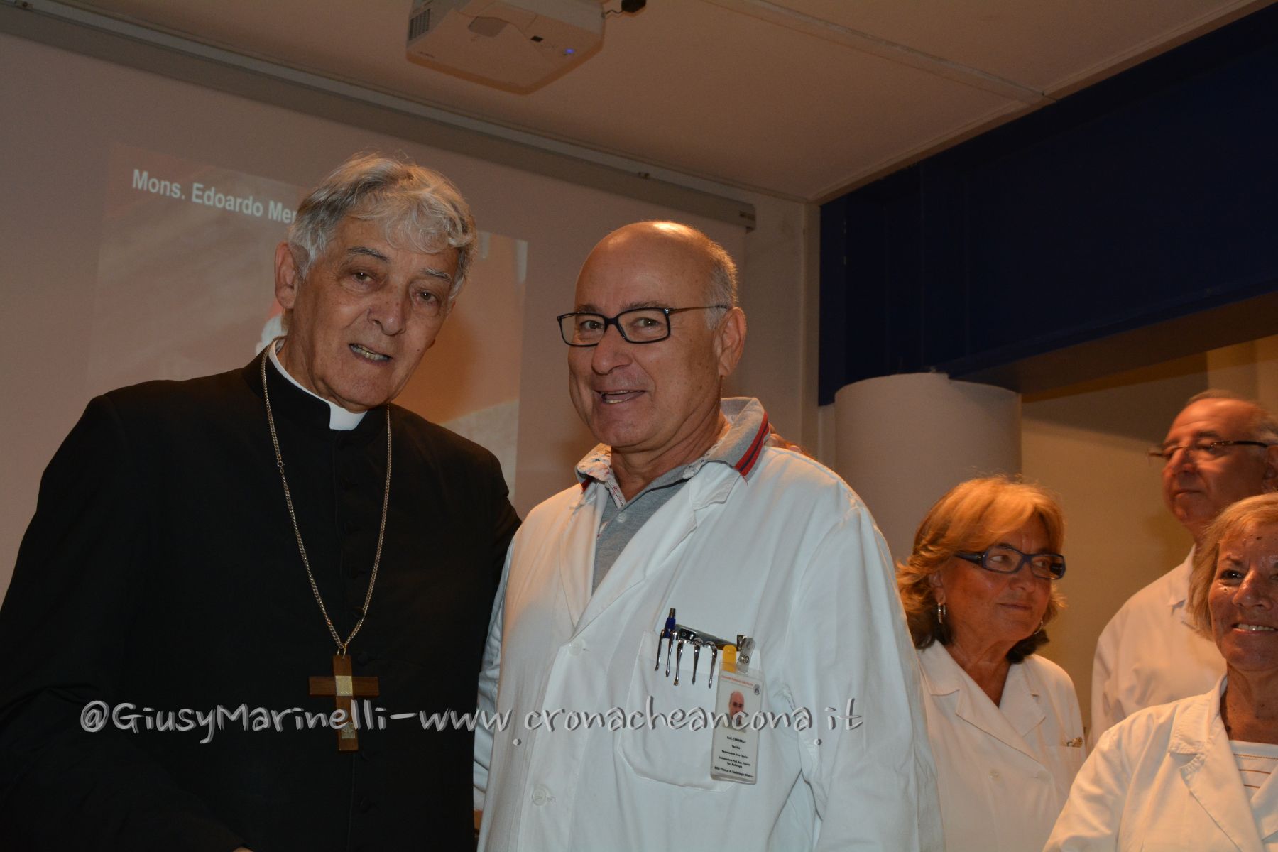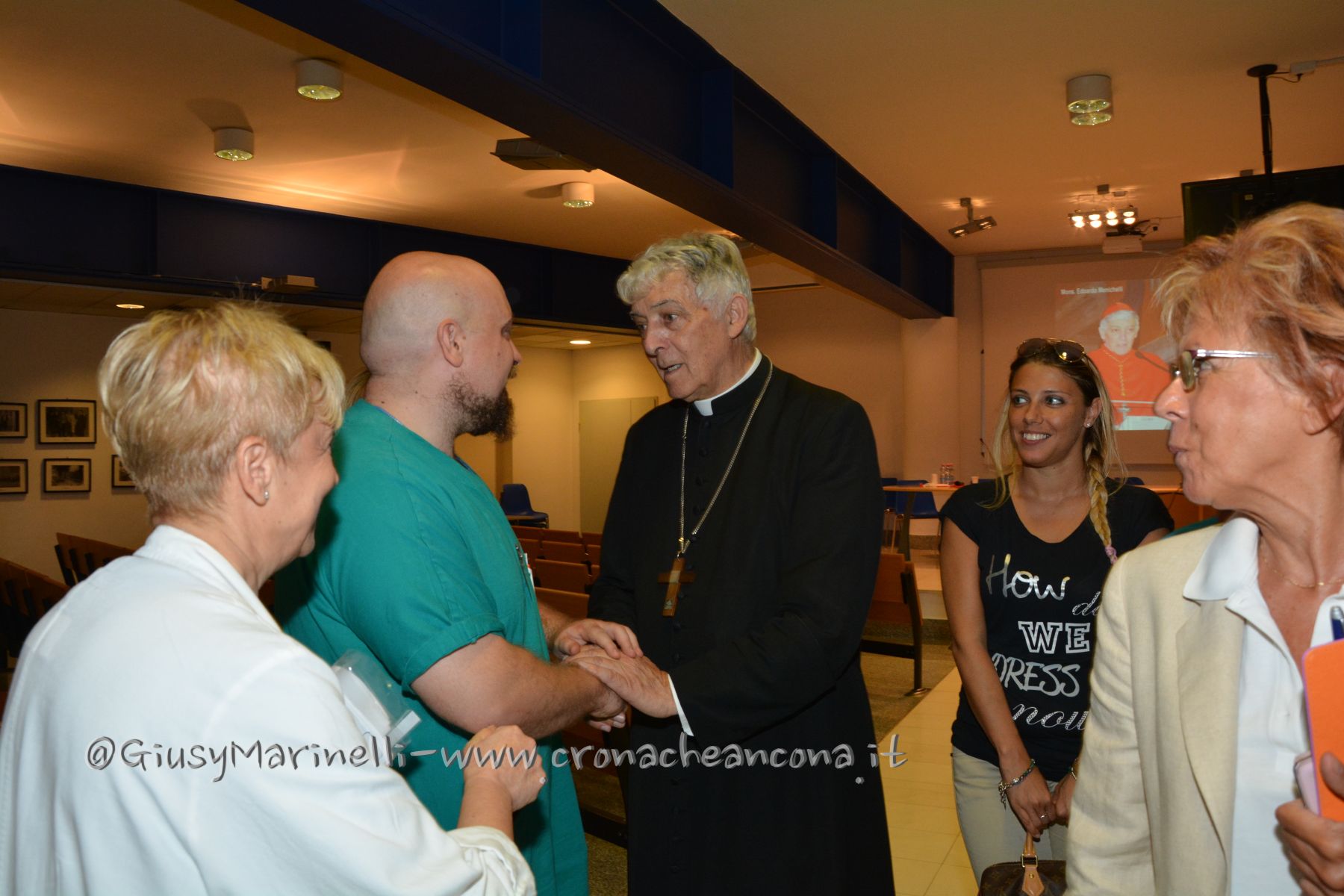 Un’ora di saluto per ringraziare i medici del loro lavoro, ma anche per suggerire e tracciare la strada ai dottori affermati e ai futuri professionisti. Il cardinale Edoardo Menichelli stamattina ha voluto incontrare i primari e gli operatori sanitari dell’ospedale regionale di Torrette in uno dei suoi ultimi appuntamenti come arcivescovo di Ancona e Osimo. Il 24 settembre il saluto ufficiale alla città, che già si è stretta attorno a Menichelli domenica scorsa per la celebrazione della Festa del Mare (leggi l’articolo), il primo ottobre subentrerà il vescovo Angelo Spina (leggi l’articolo). L’ospedale di Torrette è stata una tappa in questo percorso di avvicinamento. Un saluto particolare ai primari e ai medici che Menichelli sente particolarmente vicini, anche nel ruolo di assistente spirituale nazionale dell’Associazione medici cattolici. Il cardinale ha avuto parole di ringraziamento per il lavoro svolto dai sanitari. “Ovunque vada sono lieto degli apprezzamenti che sento della sanità delle Marche e di Ancona” ha spiegato Menichelli, ricordando le sue visite in questi anni nei luoghi di cura. Una in particolare, quando il cardinale è svenuto “davanti alla sofferenza di un bambino del Salesi che mi voleva bene, e teneva anche la mia foto sul suo cuscino” ha ricordato Menichelli.