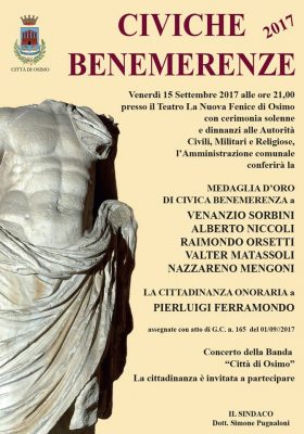 Anticipata a venerdì 15 settembre, quest’anno, la cerimonia di conferimento delle civiche benemerenze che torna ad essere organizzata al teatro La Nuova Fenice. La serata, inserita nel cartellone degli eventi patronali, partirà alle 21, vedrà protagonisti personalità storiche di Osimo e sarà animata dall’intrattenimento musicale della banda Città di Osimo. Salgono a 5 in questa edizione i cittadini meritevoli che ritireranno la medaglia d’oro. Sono Padre Venanzio Sorbini, tra i fondatori dell’Accademia Lirica di Osimo, gli ex sindaci Alberto Niccoli e Raimondo Orsetti, Valter Matassoli icona della pallavolo osimana e un tempo stella del volley nazionale e l’imprenditore Nazzareno Mengoni. Sarà invece insignito della cittadinanza onoraria Pierluigi Ferramondo (leggi l’articolo). A questi riconoscimenti si aggiungeranno i premi alla memoria, al lavoro ed altri encomi civici. I