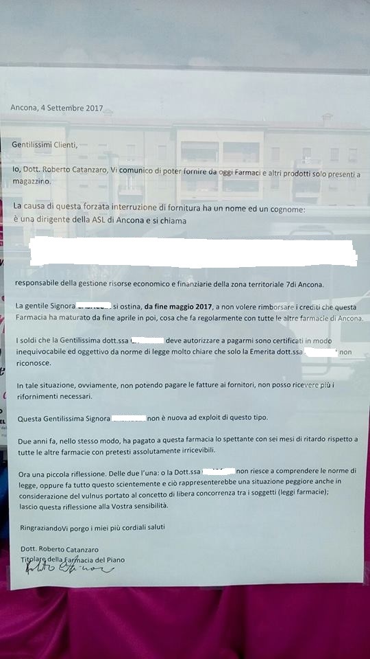 La zona territoriale 7 dell’Asur non paga i suoi debiti, la farmacia del Piano costretta a vendere solo farmaci e prodotti di magazzino. È il cartello apparso all’ingresso dell’attività di piazza Ugo Bassi da qualche giorno. Il dottor Roberto Catanzaro, proprietario della farmacia, ha affisso la comunicazione rivolta ai suoi clienti. «Vi comunico di poter fornire da oggi farmaci ed altri prodotti solo presenti nel magazzino − si legge nel cartello −. La causa di questa forzata interruzione di fornitura è di una dirigente della Asl di Ancona, responsabile della gestione risorse economiche e finanziarie che si ostina da maggio 2017 a non voler rimborsare i crediti che questa farmacia ha maturato da fine aprile in poi, cosa che fa regolarmente con tutte le altre farmacie di Ancona. In tale situazione − continua la comunicazione − non potendo pagare le fatture ai fornitori, non possono ricevere più la merce necessaria».