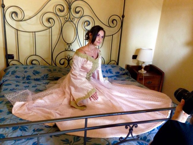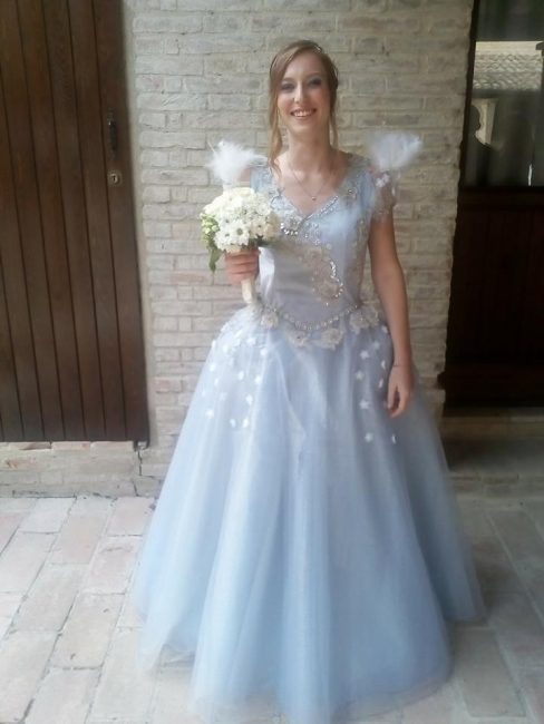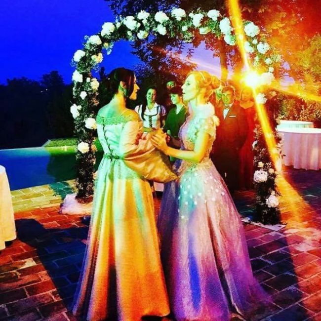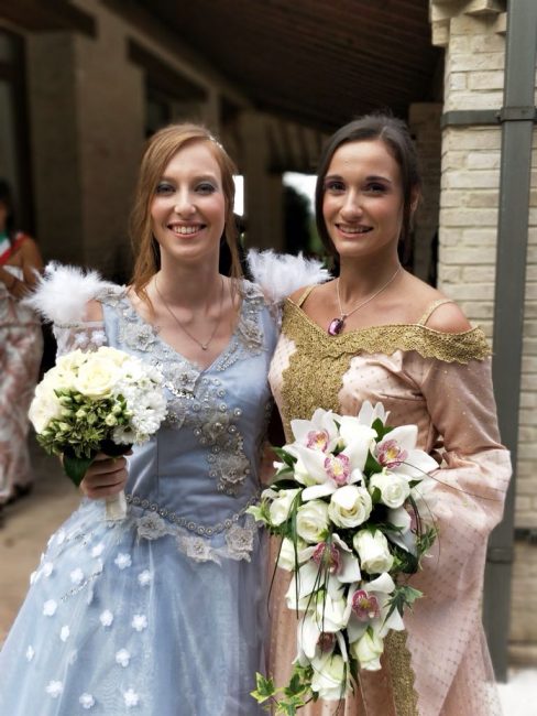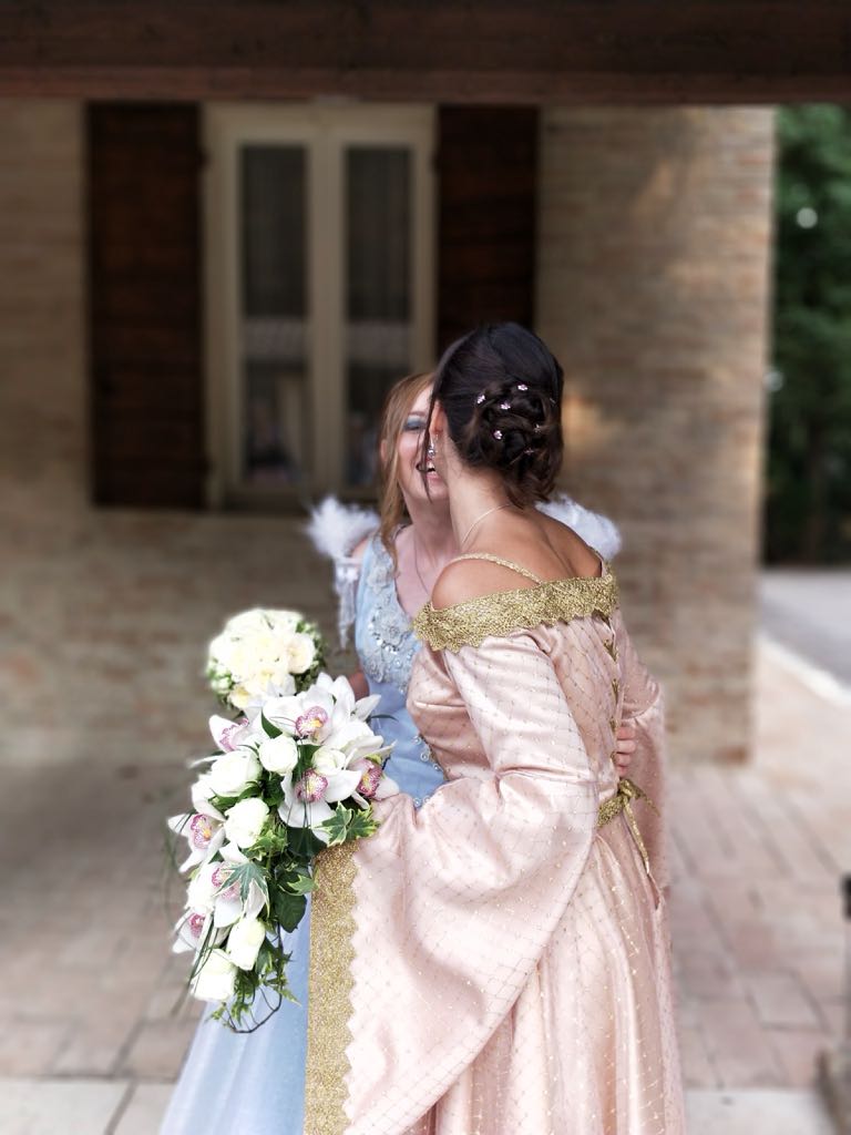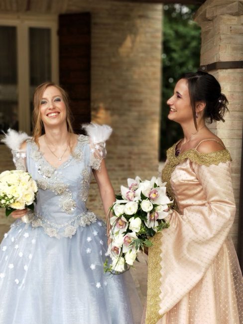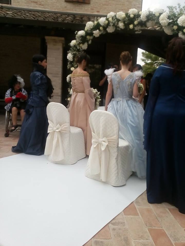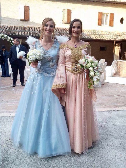 Alle 18 dopo il pranzo di nozze, però, la scenografia è cambiata. Sfilati via i loro abiti eleganti, bianchi e blu avio a contrasto, le spose, che hanno l’hobby di vestirsi e interpretare il loro personaggio preferito del telefilm statunitense secondo la moda cosplay, sono state risucchiate in un vortice di allegria. Con gli amici più cari sono finite in una nuova dimensione spazio-temporale fantastica ricreata nel castello di Montegiove, a Fano. Un background perfetto per la seconda cerimonia, scivolata via in un mondo incantato. ‘Once Upon a Time’ (C’era una volta) è infatti una serie tv che si ispira a leggende, fiabe e ai personaggi dei film d’animazione Disney. A Fano Arianna, 25 anni, ha indossato i panni di Emma Swan, la protagonista del serial, la ‘salvatrice’ figlia di Biancaneve e del Principe Azzurro, infilandosi un abito azzurro con tulle e ricami, e Angela, 30 anni, si è trasformata in Regina Mills, la regina cattiva, avvolta in un elaborato abito rosa antico. I loro sontuosi costumi sono stati realizzati da nonna Maria Paola.