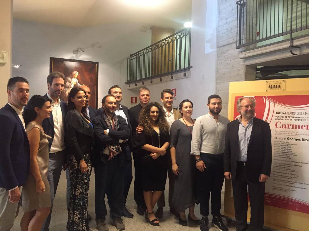 Il cast della Carmen in scena alle Muse presentato oggi dal direttore artistico De Vivo (primo a destra)