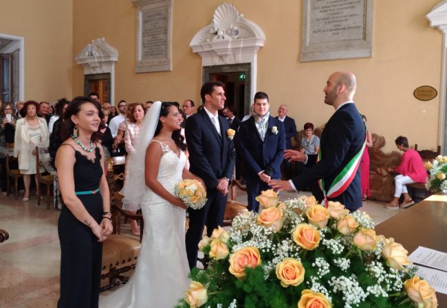 Osimo, gli sposi Miriam Simonetti e Marco Albanesi uniti in matrimonio dall’assessore alla cultura del Comune di Chiaravalle, Francesco Favi