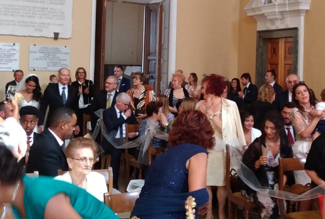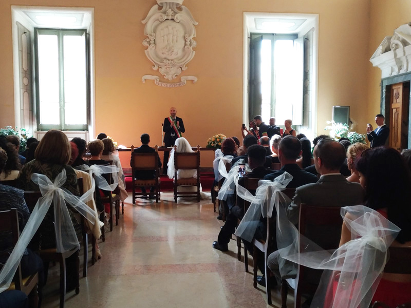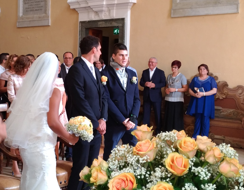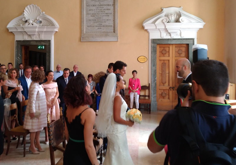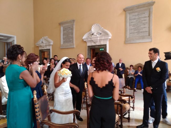 Non poteva che risplendere un sole caldo nella giornata di festa che ha fatto da cornice alle nozze di Marco Albanesi, 30 anni di Castelfidardo e Miriam Simonetti, 27, di Osimo. Lui è un project manager del Loccioni Group, lei lavora per l’azienda di famiglia che commercializza salmone affumicato norvegese di qualità superiore in tutta Italia, lavorando con le principali insegne dei supermercati. Felici, eleganti e innamorati, stamattina nella Sala Maggiore del Comune di Osimo, Miriam e Marco hanno pronunciato le promesse matrimoniali davanti a un ‘celebrante’ speciale: Francesco Favi, assessore alla Cultura del Comune di Chiaravalle. Speciale perché Favi è stato professore di Italiano di Marco, al V liceo scientifico ‘Campana nell’anno scolastico 2005-2006. “Un alunno modello che si è diplomato con 100/100 e che in seguito si è laureato con ottimi voti in ingegneria aerospaziale al Politecnico di Torino” racconta il docente, oggi insegnante di Lettere alle medie Donatello dell’I.C. Cittadella-Margherita Hack di Ancona.