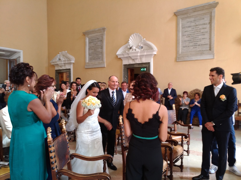 La coppia ha scelto il palazzo comunale di Osimo per la cerimonia con rito civile. Bellissima la sposa, in abito bianco con leggero strascico, velo e capelli lasciati sciolti in una elaborata acconciatura, entrata in scena poco dopo le 11 di stamattina al braccio del padre. In mano stringeva il bouquet di rose gialle-arancio che richiamavano gli addobbi floreali della sala ed il fiore all’occhiello sulla giacca del futuro marito. C’erano proprio tutti a festeggiare i due ragazzi, i parenti e gli amici di sempre. Il pranzo di nozze si è svolto nell’Antica Cantina Sant’Amico di Morro d’Alba, in un pomeriggio assediato dalla pioggia, che ha garantito comunque una festa costellata di applausi e abbracci. La coppia partirà nei prossimi giorni per la luna di miele da trascorrere nella penisola della Yucatan, in Messico, lontano dai luoghi del terremoto.