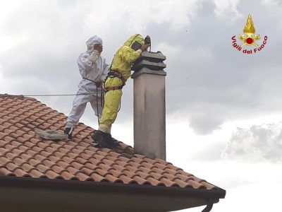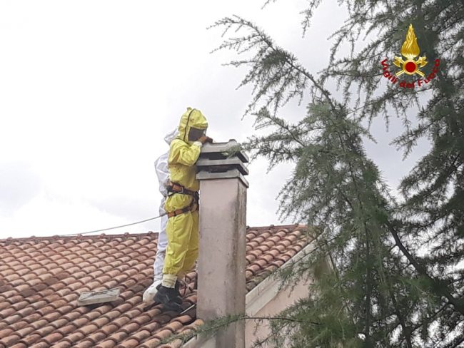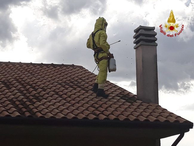 Oggi pomeriggio alle 15.30 circa, i vigili del fuoco sono intervenuti ad Agugliano in via San Tommaso d’Aquino per eliminare un favo di calabroni. I vigili del fuoco, utilizzando tecniche S.A.F. (tecniche di derivazione speleo, alpino fluviali) proteggendosi con delle tute speciali, sono saliti sul tetto e hanno rimosso il favo che si era formato all’interno della canna fumaria.